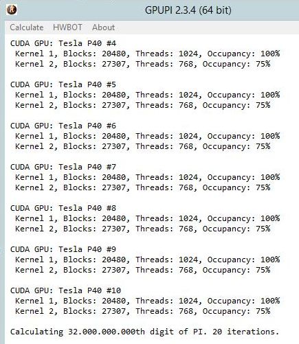 Ten accelerators NVIDIA Tesla P40 updated GPUPI records