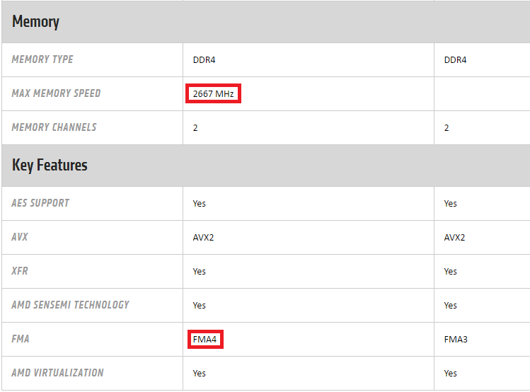 Continuing to compare the characteristics of the two versions of the same processor, we find a limitation on the memory mode (DDR4-2667) for the "professional" version, as well as support for the FMA4 instruction set, whereas for the "consumer" version only FMA3 is prescribed.