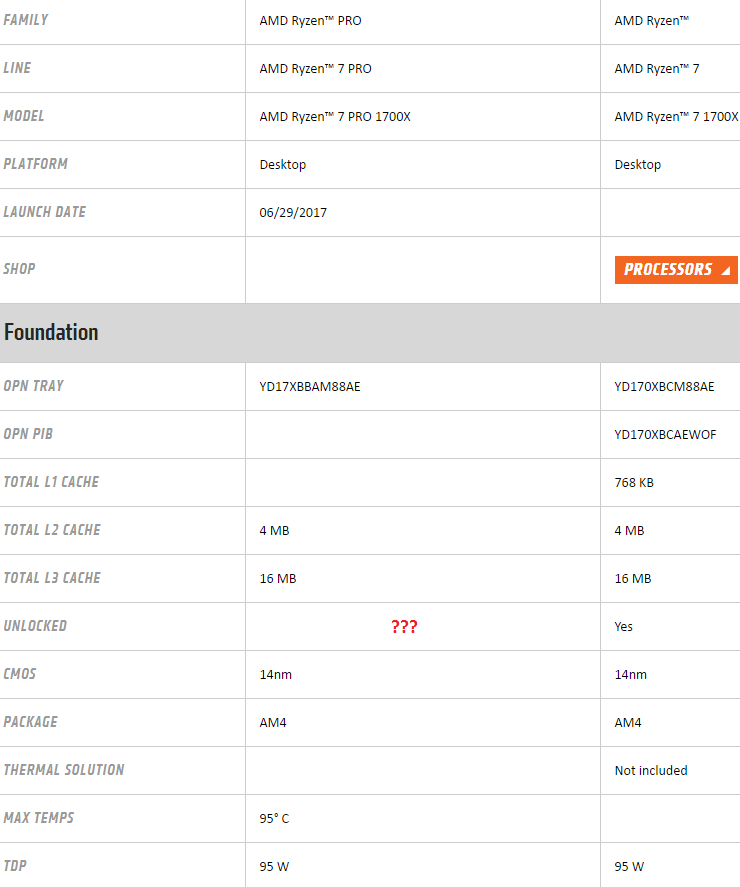 The official database on the AMD website has already been updated with information on the characteristics of new processors, including markings.  The last two characters responsible for the stepping version, the Ryzen processors remained the same - "AE".  This suggests that before us is the same "good old" stepping B1.  Accordingly, and the crystals are probably used the same, just encryption functions and protected downloads are activated additionally.  Note that for the older model Ryzen 7 Pro 1700X the complete cooling system is not provided, if you believe this table.  Apparently, this is due to the "out of the blue" value of TDP, which reaches 95 watts.