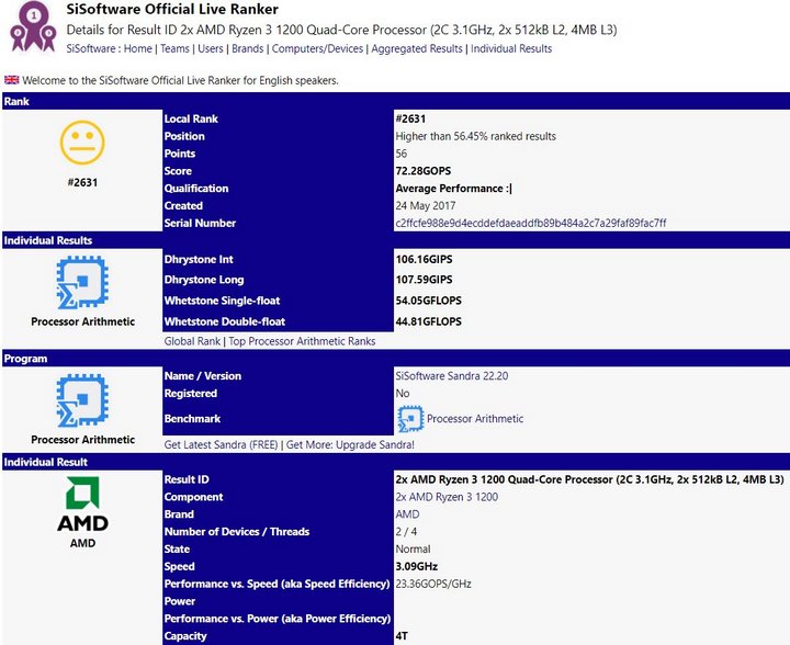 Our colleagues from WCCFTech found several results of synthetic tests of the younger Ryzen processors.  So, in the SiSoft Sandra database, a record was found about the Ryzen 3 1200 processor, where for some reason it was defined as two dual-core processors.  The processor showed very good results, demonstrating the performance in 72.28 GOPS (billion operations per second) in the overall test, and 54.05 and 44.81 GFlops in single and double precision operations, respectively.  These figures roughly correspond to the performance of the Intel Core i7-2600K (without overclocking), which is still very popular.