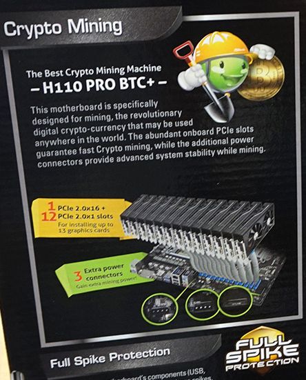 Biostar company will produce the optimal motherboard for "miners" - it equips this product with slots for connecting 12 video cards, and the corresponding connectors are arranged in two rows at the usual interval.  ASRock, as we know, is a supporter of single-row layout, and this feature of the motherboard H110 Pro BTC + is well known to us.  However, since this motherboard appeared in Japanese retail, it allows us to return to the study of its exterior.