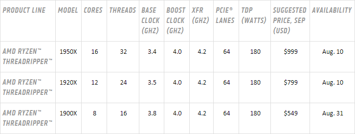 So, the initial model of the family combines eight cores, sixteen streams and frequencies of 3.8 / 4.0 GHz.  The price of the processor will be $ 549.  The cost of the other two family models was announced earlier, it is also mentioned on the slide.  True, if two older processors can be bought on August 10, then the appearance of the Ryzen Threadripper 1900X will have to wait until the end of August.
