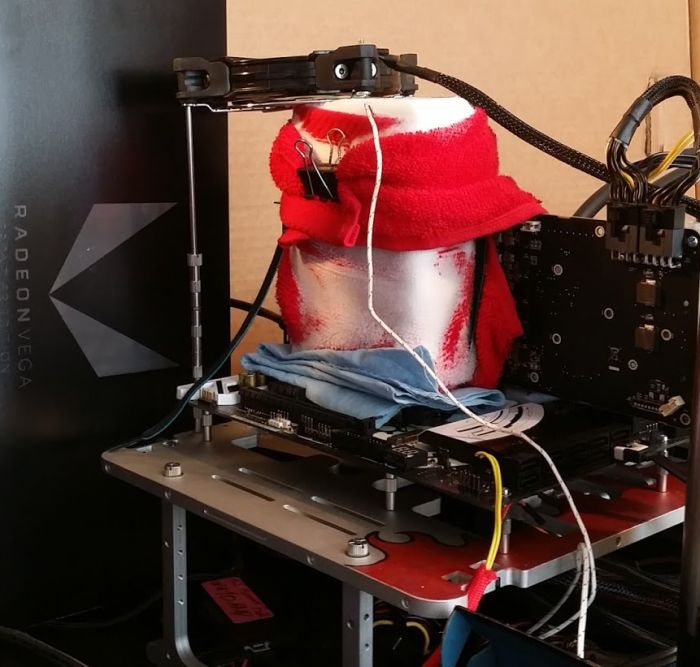 Good news can be attributed to the good tolerability of the graphics processor Vega 10 negative temperatures.  Up to a mark of minus 185 degrees Celsius there were no problems, and then the author did not advance, and even to the boiling point of liquid nitrogen is already within reach.  There is some layout inconvenience - the graphics processor is placed close to the back panel, and therefore when using liquid nitrogen, the outlets are quickly covered with frost.  The power elements are covered with frost when the video card is running without load, but in resource-intensive tests the frost begins to melt.