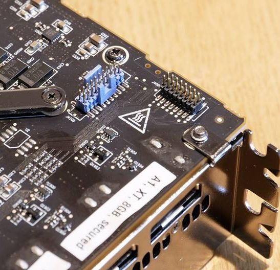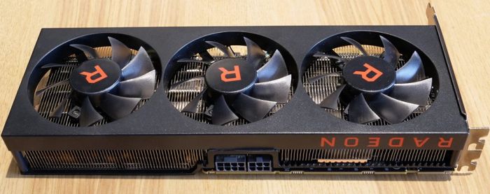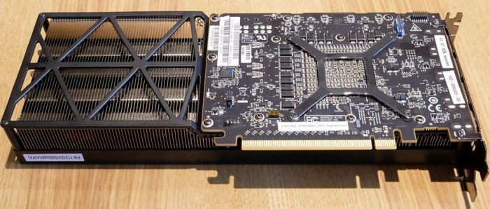 The radiator of the cooling system, penetrated by heat pipes, extends far beyond the limits of the printed circuit board.  In other photos, not only the diagnostic connectors are visible, but also the "XT" marking, indicating the belonging to the younger model of the Radeon RX Vega family.