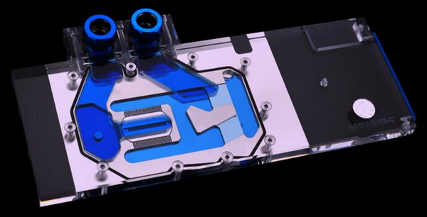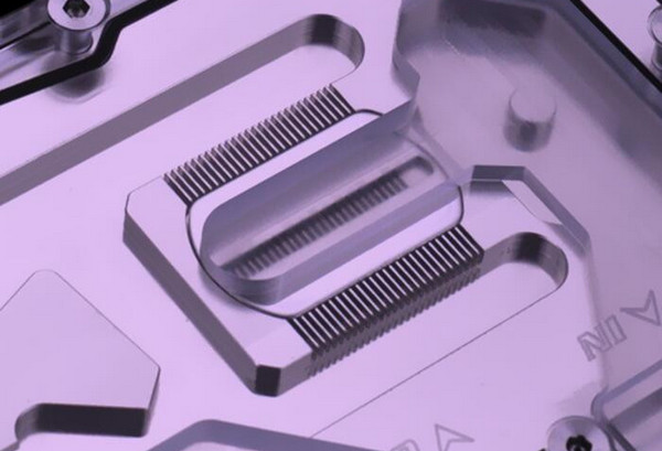 The water block has a copper base, which is covered with a layer of nickel to protect against corrosion.  In the place where the water block is in contact with the GPU and the HBM2 memory chips next to it, there is a "comb" of microchannels 0.5 mm wide, which, by their design, are very similar to the EK Water Blocks waterblocks.  As in the case of any full-coverage water-block, A-VEGA-FE-X also contacts the elements of the power supply system .  This allows better heat removal from the video card and in theory will achieve higher frequencies in overclocking.