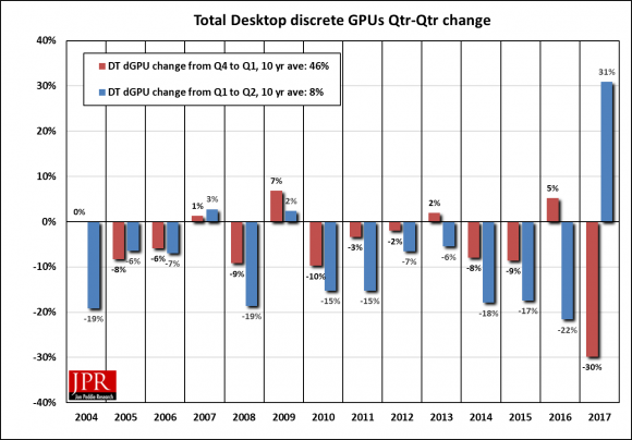 Analyst company Jon Peddie Research summed up the performance of companies in the market for video cards for PC in the second quarter of 2017. The statistics obtained are pretty much out of all that has been observed in this market for the last two decades. Traditionally, in the first quarter, the demand for adapters either decreased slightly or was flat. In the second quarter, shipments plummeted as sellers and system builders were selling stocks on the eve of the summer months. In