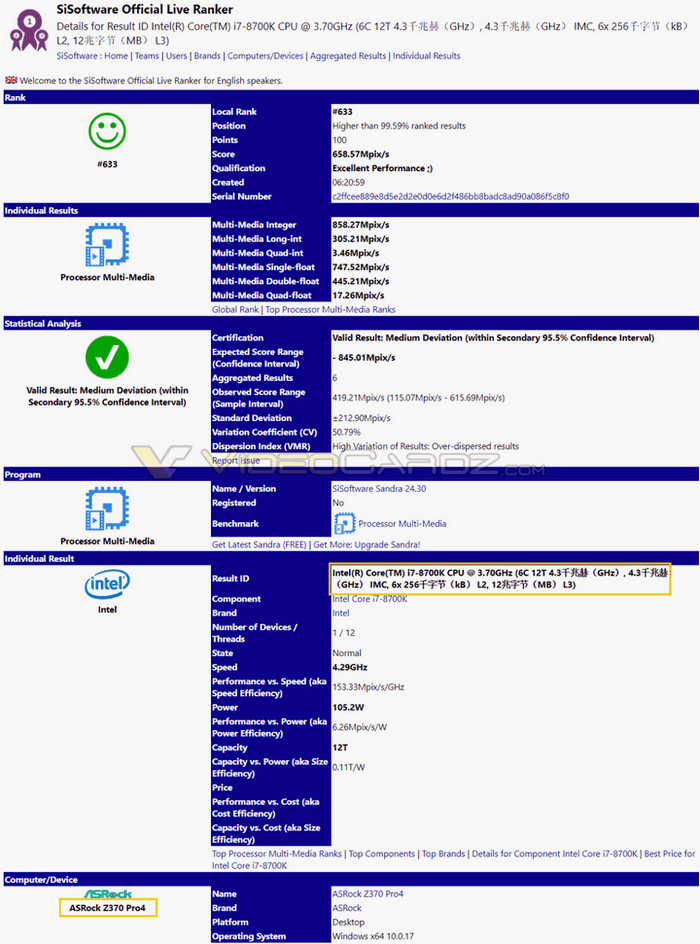 Our colleagues from VideoCardz managed to find in the SiSoft performance test record a test of the Intel Core i7-8700K processor installed in the consumer motherboard built on the chipset of the Intel Z370   chips, namely ASRock Z370 Pro4.  The test once again confirmed the processor has six cores and twelve streams with frequencies of 3.7-4.3 GHz.