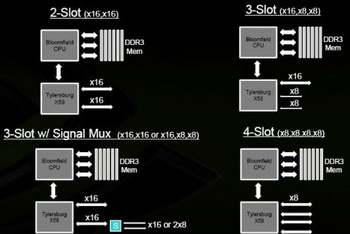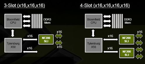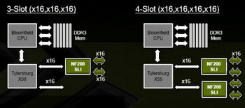 The announcement of skulltrail platform , provided SLI support for Intel chipset with the use of two chips nForce 200 SLI. This solution was not advantageous due to the high price and the low speed , skulltrail platform did not become popular; however, this SLI support model was postponed in the preparation stage for bloomfield announcement and Intel x58 chipset .
