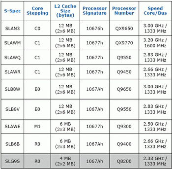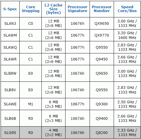 On R0 stepping (which is petty similar to E0 except with lower cache) for example, are based the processors core 2 Quad q9400 (2.66 GHz) with 2 X 3 MB cache in the second level and Core 2 Quad q8200 (2.33 GHz) with 2 X 2mb cache in the second level. Note also that dual core wolfdale processors with cache volume not more than 3 MB will be also transferred in R0 stepping . Related Products :
