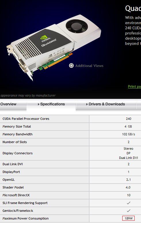 As note associates , the video card quadro FX 5800 has the core frequency 650 MHz , it's TDP is not more than 189 W, whereas the video card GeForce GTX 280 has a TDP not more than 236 W with core frequency 602 MHz. It turns out that new video card with faster core consumes less electric power !