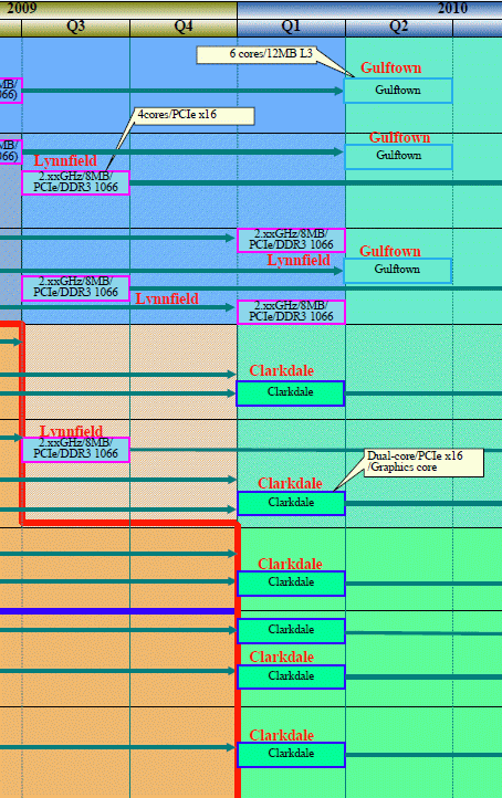 Associate confirmed information about the acceleration of 32 nm processors announcement . New Intel road map report, that the dual core desktop processors clarkdale with the integrated graphic core will appear in the first quarter 2010, and the six-core processors gulftown LGA 1366 will appear in the second quarter 2010.