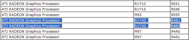 Today in a AMD division, appeared a reference about the RV740 video chip. The list of supported by drivers Catalyst graphical solutions also contain references about the mobile chips m93 and M97, supposedly produced on 40 nm technical process.