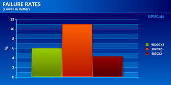 Two-Gpu video cards break more frequently than their single-chip analogs. Six percent Of GeForce 9800 GX2 was returned in connection with failure. The first two-chip AMD Radeon HD 3870 X2 fails in  11% of cases; however, the Radeon HD 4870 X2 was better with only 4.3%  failures.