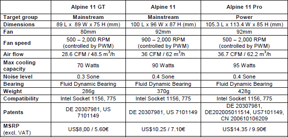 The model alpine 11 GT is ready to remove up to 70 W of thermal energy from the processor, Alpine 11 and Alpine 1 Pro are ready to work with up to 90 and 95 W respectively. Related Products :