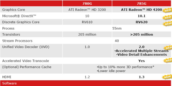 Since the memory controller already moved to the processor, and motherboard producer determines the type of utilized memory. Accordingly, AMD 785G chipset can work both with socket AM3 processors and DDR-3 memory and with socket AM2+ processors and DDR-2 memory . AMD 785G does not bring any revolutionary changes .The support of directX 10.1 and UVD 2.0, and also HDMI 1.3 appeared.