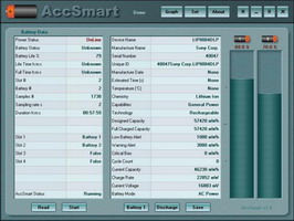 AccSmart reflects detailed information about the batteries (up to 4 simultaneously) and allow to monitor their current charge level . AccSmart can also activate the discharging process and build the appropriate graph.