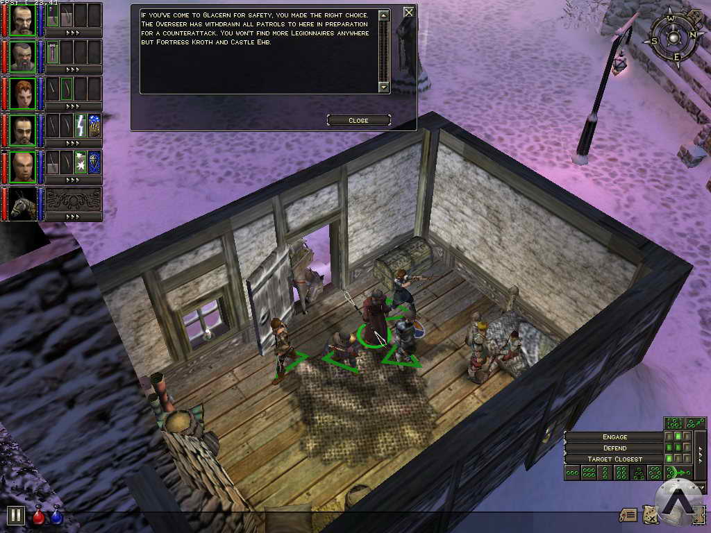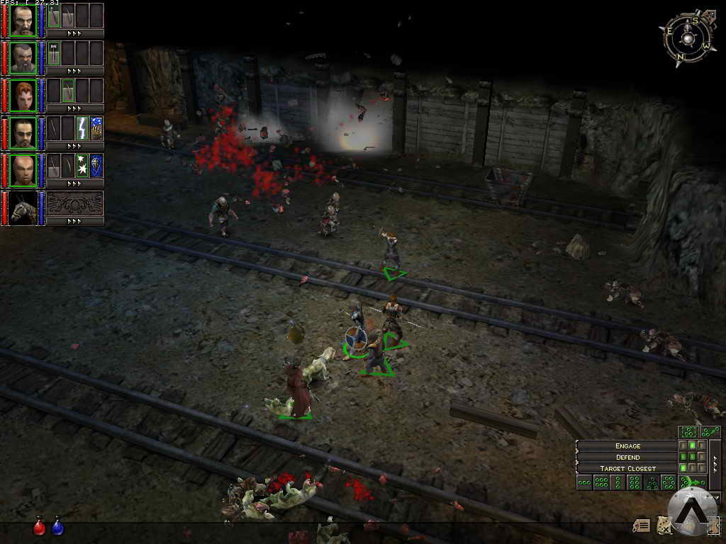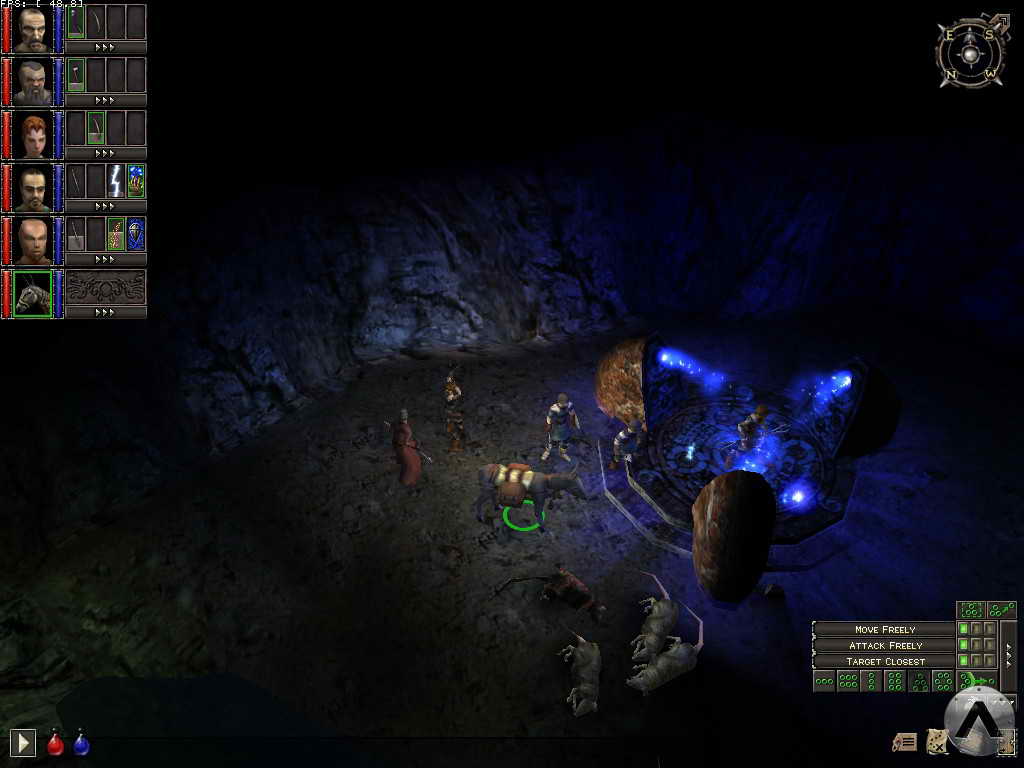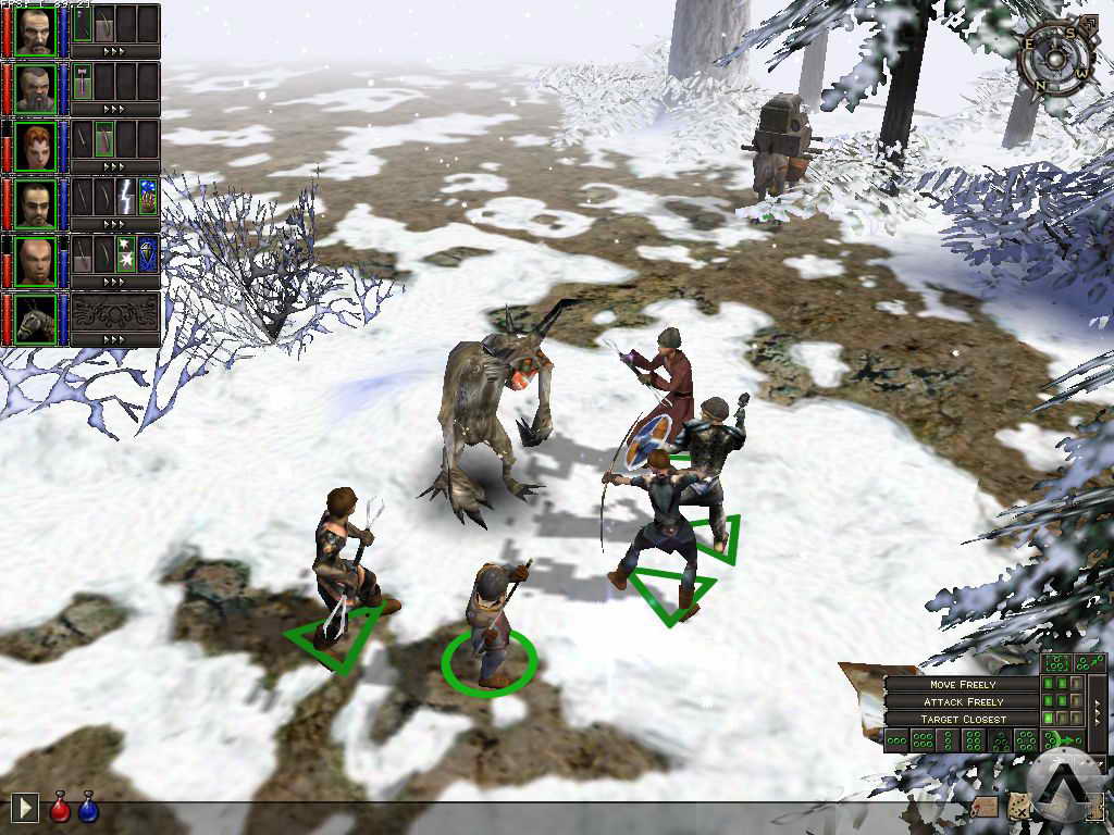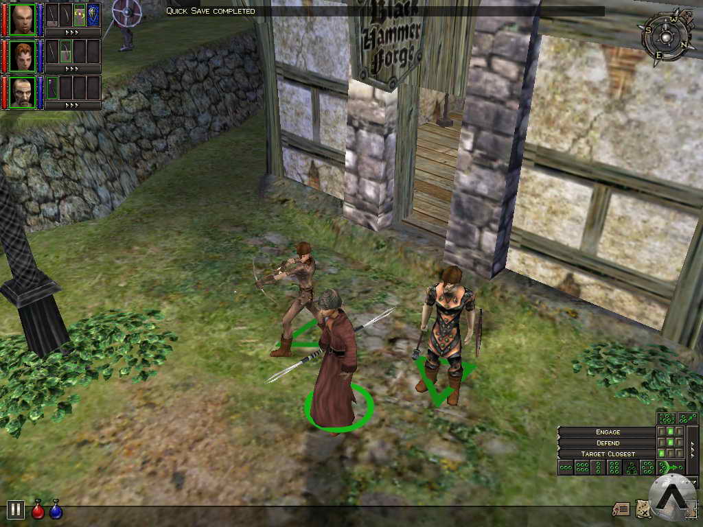 The bottom right corner offers character AI settings and formation controls. It is a bit more cryptic, but still compact and highly functional. Formations can be dynamically adjusted by holding the right mouse button and moving the mouse to rotate the formation, or by turning the mousewheel to tighten or loosen it. Dungeon Siege also includes a highly functional map screen accessed through the Tab key. The map is simply a bird\'s eye view of the action, with stylized representations of characters, enemies, and treasure for easy identification. Any type of orders can be issued from the map screen, including battle and movement commands.