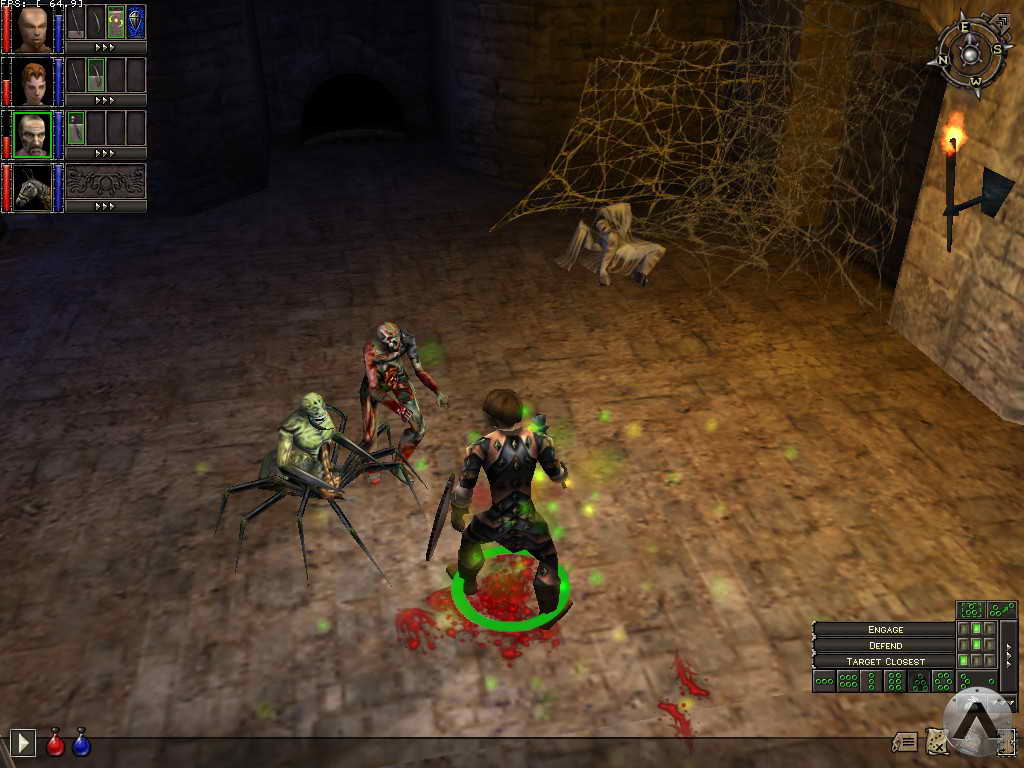 Gameplay: Gameplay in Dungeon Siege is very simplistic and tends toward monotony: You run around the world killing things. Occasionally you talk to a person and buy goods, but mostly it\'s just killing things. This wouldn\'t be so bad if there were new, interesting, and exciting ways of killing things, but Dungeon Siege just doesn\'t bring that much new to the table. With its interface set up for strategic gameplay, one would expect many situations where a good deal of tactical thinking could improve the odds. The reality is very little strategy is required. Battles are simply wave after wave of enemies throwing themselves against your defenses. In fact, the vast majority of battles can be won by simply moving your characters into the center of the enemy mob, then staring at their portraits, and pressing the "drink health potion" button when one of them starts to flash yellow. In densely guarded dungeons, I found myself actually staring at the character portraits more than I did the actual battles. This fostered a strong sense of detachment that got in the way of my enjoyment.