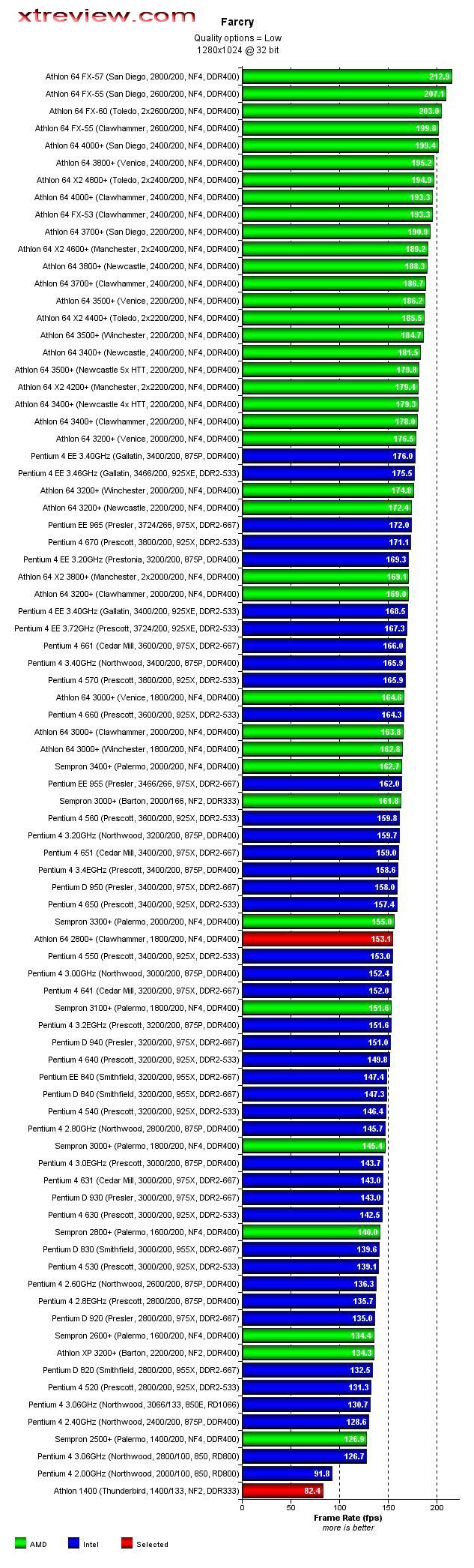 cpu are non exciting in this cpu comparison chart but the result can be retreived here .the conroe sould be the winner here.as seen the amd 64 is better that intel when time come to game.even the younger model the 3200+ 939 withc clocked at only 2200 mhz take the lead of all intel cpu .even the 3800 mhz intel could not catch up the EE "xtreme edition " has failed in this benchmark.