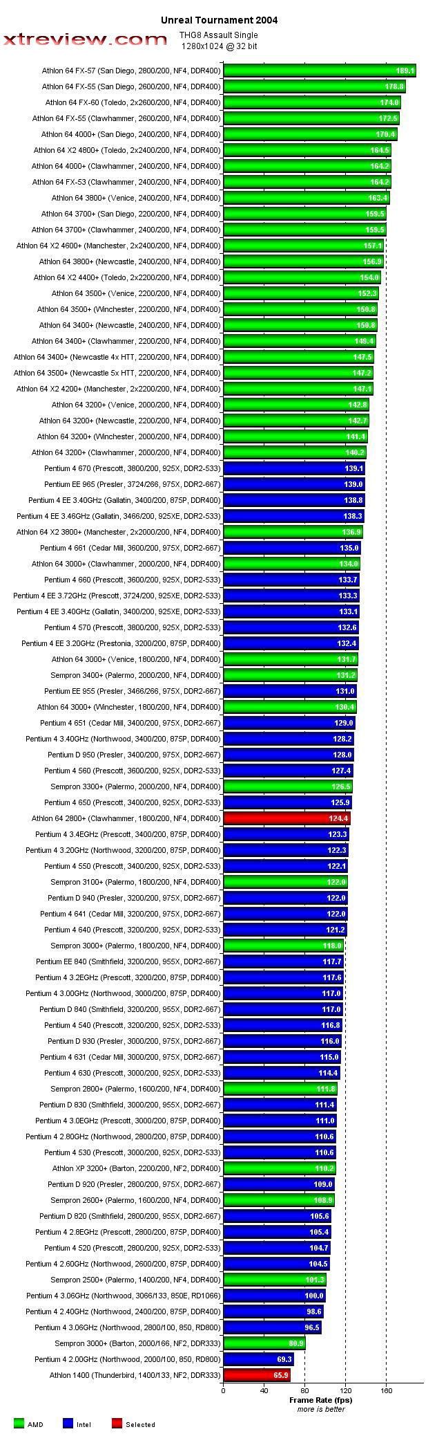 unreal 2002 is based on the most powerful gaming engine and it is optimized for FPU unit .this game has alwais better result with amd ,this come as confirmation for the robust amd FPU unit.the first amd here is for sure the FX 57 .the hyperthreading thecnologie or dual core cpu will not play any role in this case .so the most clocked amd will be the winner and other will follow .the first intel cpu that show up is was been outscored by about 50 FPS witch is huge this about 30% from average fps.new intel conroe