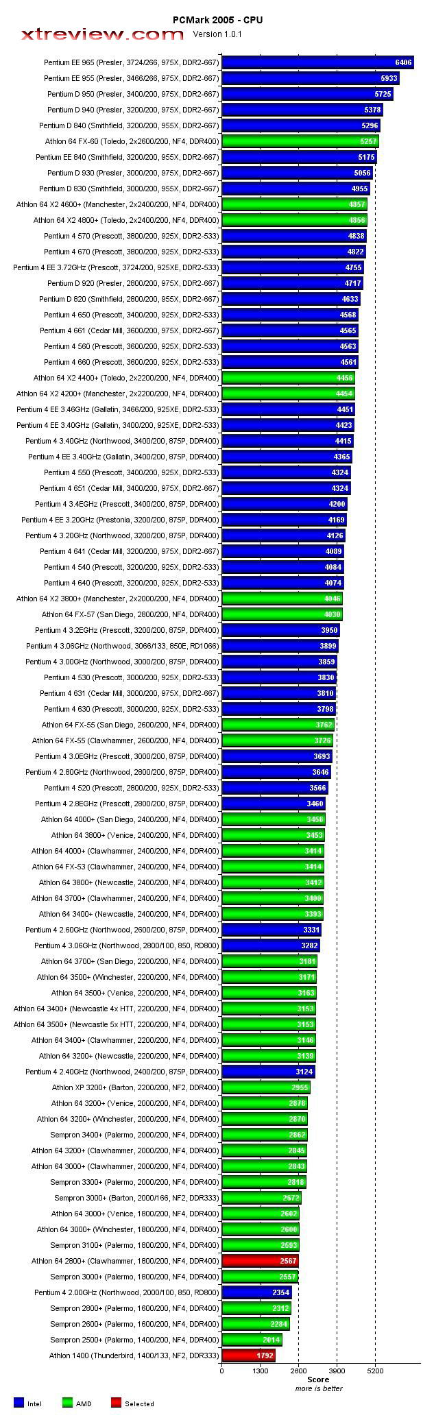 well pc mark is optimzed for hyperthreaded and multitasking  this could  would be expliquation for such value. intel is getting the lead here by far.none of the amd cpu could show a respectable result the fastest amd cpu  on this benchmark is the FX60 dual core amd cpu got beaten by 25% from intel EE