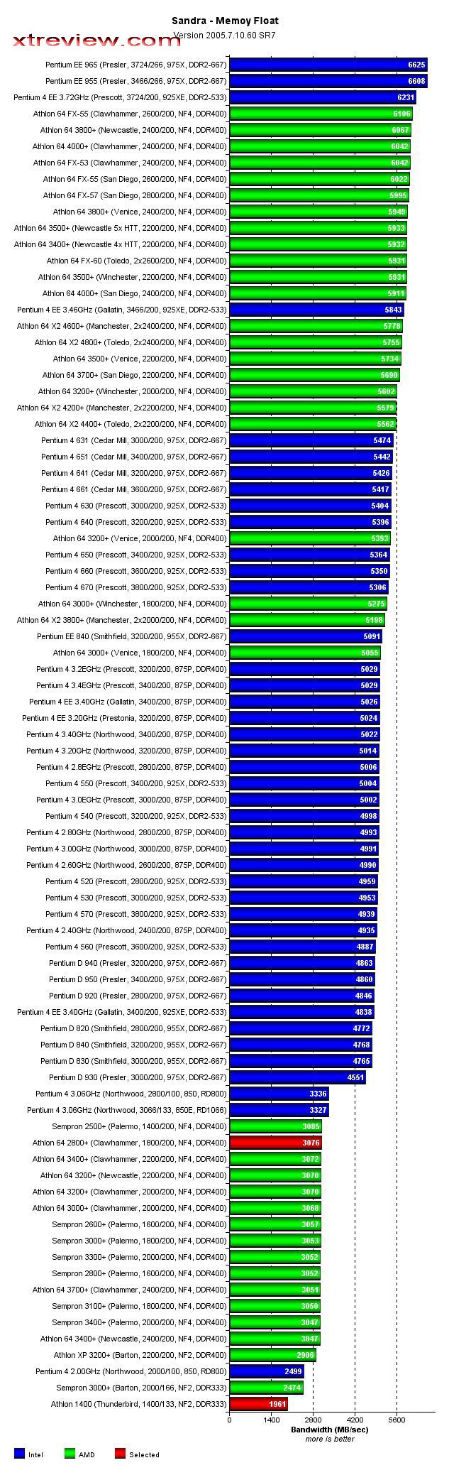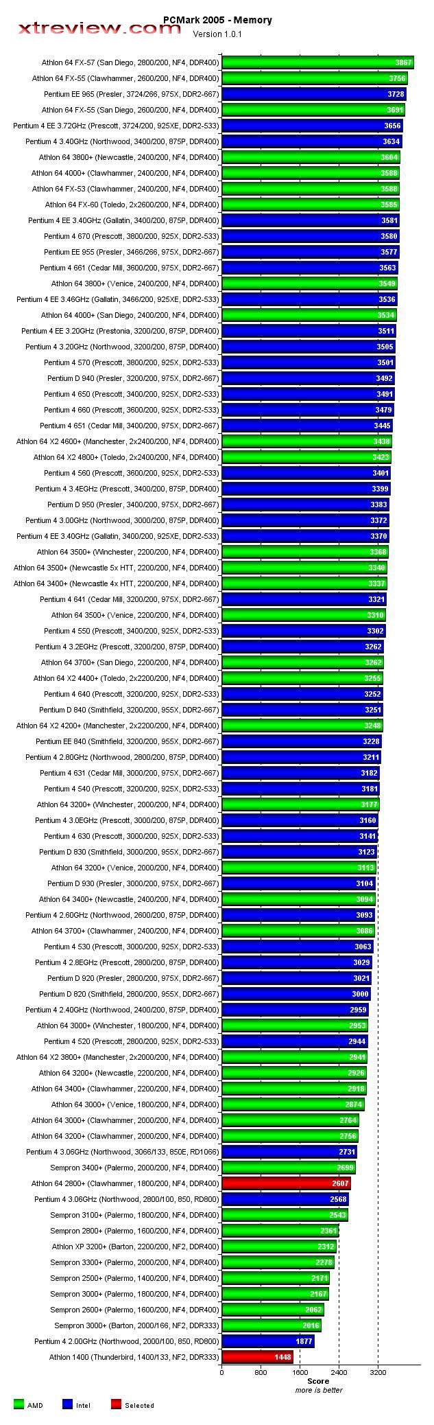 Memory result from pc mark 2005 benchmark are quite different the amd take the lead here . it do not metter how many cpu u have. single or dual core cpu.so THe fx 57 is the winner.amd has an integreted memory controler so the higher u clock the cpu the faster can cpu acess to memory and higher will be the bus
