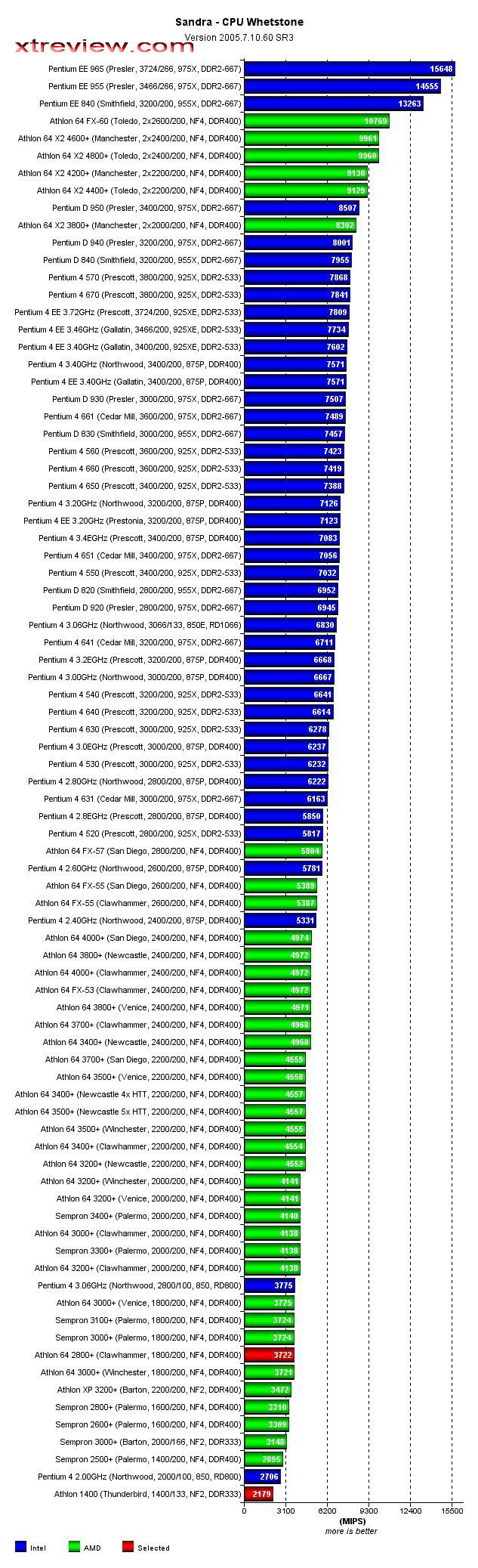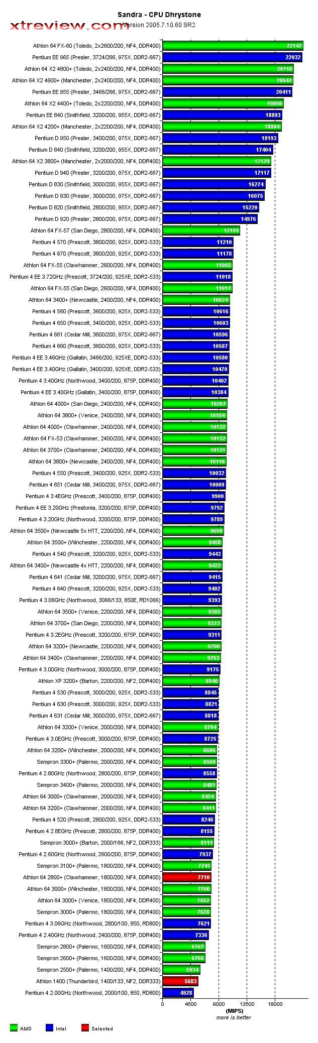 and here is another multithreaded benchmark from sandra.the reslt are quite interssing here look for the leader .the amd fx 60 has about 22000 mips and the fx 55 has 11000.in theorie the result show be right the fx 60 is clocked at 2600 MHz 1 mb of cache and dual core and the fx 55 is exactly the half only one cpu working at those value.