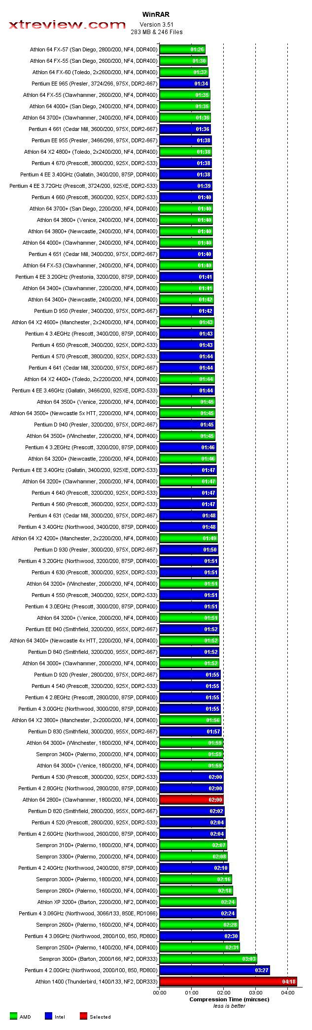 last benchmark test in cpu comparison chart is with winrar.here a software that is daily used for compression and decompression.there no multithreading here this should explique the FX 57 lead here.in general amd is better for decompressing "clock for clock faster than intel" and intel should be better on compressing due to larger pipe and cache size.