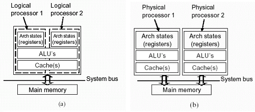 On the left side you can see a CPU with Hyper-Threading, while on the right - a regular dual-processor system