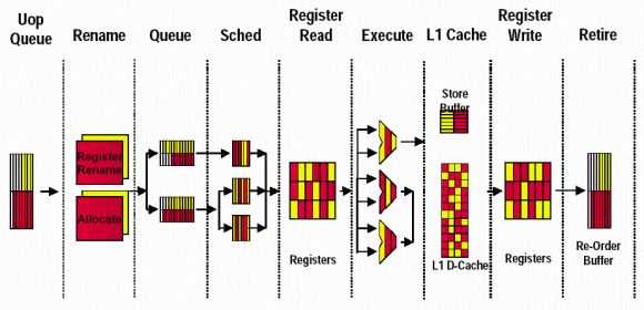 Then the micro-operations sorted out this way get to the Scheduling stage, where they are sorted according to the order in which they arrive to the execution units. The operations are sent to the scheduling units according to the first-in-first-out policy. If necessary, the scheduling units can switch from the queue arranged for one logical CPU to those for another one. By the way, at this stage the micro-operations coming from the logical CPUs get totally mixed up, so that they could be executed simultaneously. Since the registers of the physical processor turn very hardly tied to the registers of both logical CPUs, it appears possible to execute instructions without knowing where which command belongs.