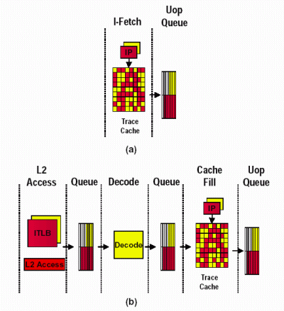 The first part of the Pentium 4 pipeline is responsible for submitting micro-operations (uops, the decoded x86 instructions) to the execution part of the pipeline. This is exactly the place where all units duplicated for two logical CPUs are located. The picture below shows the beginning of the processor pipeline in two cases: with an instruction in the Trace Cache (a) and without it (b).