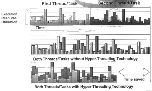past the 3GHz point appeared a much more significant event than it had been initially planned. And the primary reason for the tremendous stir around the thing is the support of Simultaneous Multi-Threading technology, which Intel calls simply Hyper-Threading (hereinafter we will refer to it using Intel\'s term). Intel is already using Hyper-Threading technology in its Xeon processor family, and it was expected to appear in desktop solutions with the launch of 0.09micron Prescott based processor. However, very cut-throat competition with AMD as well as the coming announcement of 8th generation AMD Hammer processors pushed Intel to make a few changes to its plans. As a result, Hyper-Threading technology appeared in Pentium 4 CPUs now already, which is about a year earlier than it has been initially planned.