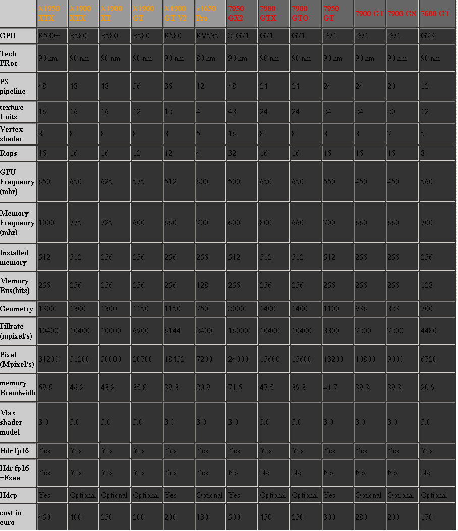 A little higher in the range, GeForce 7950 GT has also its equivalent from ATI. In version 256 Mb, Radeon X1900 XT witch show better performances with price of 250 ˆ.