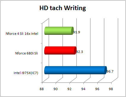 In addition to the tests applicatifs or synthetic, we were interested in the performances of certain quite precise functions of the chipset. We thus tried to evaluate the performances of the RAID 0 made up of two hard disks Hitachi 80 Gig each one interfaced in Serial-ATA 3Gb/S. We use for our tests the HDTach software. As u can see it on the graph above, and with the general surprise, the performances of RAID INTEL are higher in writing than those of RAID NVIDIA. Side reading on the other hand our three solutions are with equality. Note that the recorded values correspond to a flow expressed out on Mb/S.