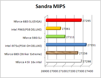 we remains in the test synthetic by using this Sandra time 2007 SP1. Sandra confirms the observations already seen on PCMark 05 and 3DMark 06. No obvious difference on the level of the performances is visible for processor with our P965, our i975X or our various nForce.