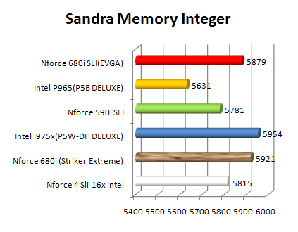 On the other hand, the test of the memory under Sandra 07 is shown definitely more instructive. The i975X of INTEL is here at the head, the nForce 680i SLI being right behind. vs its predecessor, the nForce 590 SLI INTEL Edition, the nForce 680i SLI is 2% here more powerful. Compared with P965, the last chipset of NVIDIA displays performances higher memories practically 6%.