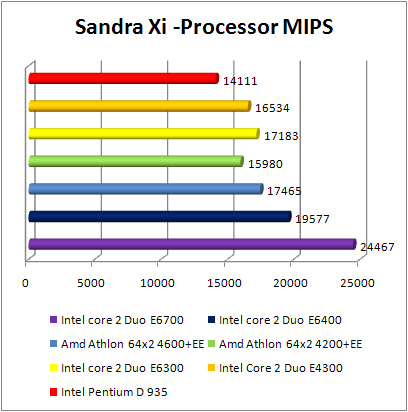 Sandra Xi made in favor the Core 2 duo E6700 . In all the cases Core 2 duo E4300 seems as powerful as Core 2 duo E6300 whereas Athlon 64 X2 4200+ is equal with Core 2 duo E6400 in the level of MFLOPS, but it loose when MIPS are considered.