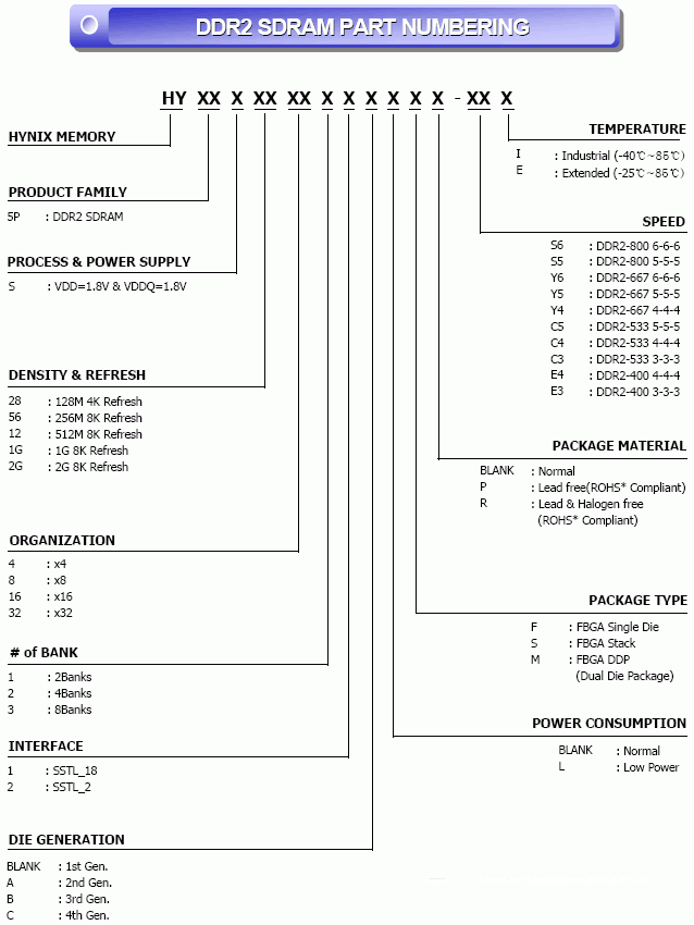 The specifications of chips can be downloaded from the official site (PDF, 4.1 mb.). There it is possible to find the diagram to interpret the marking of DDR2 hynix memory :
