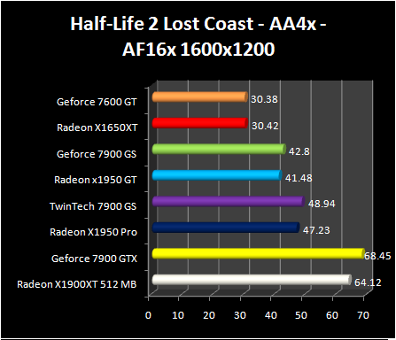 Under Half-Life 2, our two most powerful card the leader, GeForce 7900 GTX followed by Radeon X1900 XT. Radeon X1950 GT is 27% faster than GeForce 7600 GT, this last being with equality with Radeon X1650 XT. Radeon X1950 Pro thus preserves a considerable advantage over Radeon X1950 GT, which reaches the 14% here.