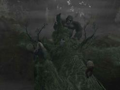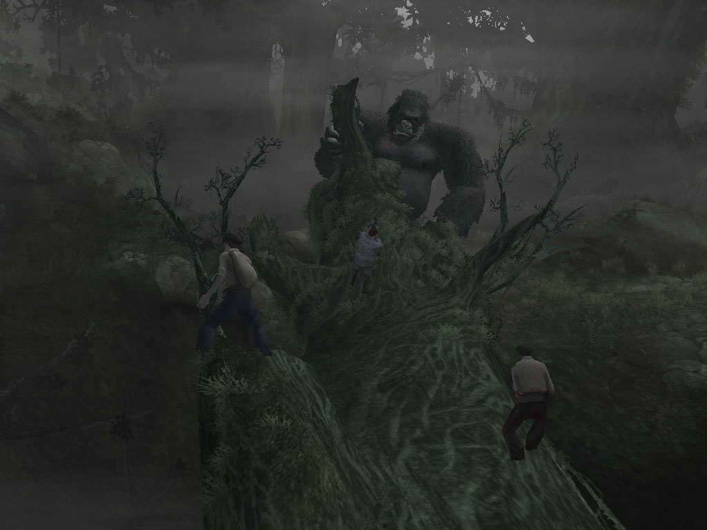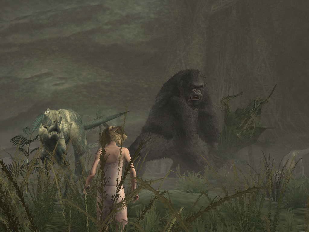 While the first-person shooter elements of Peter Jackson\'s King Kong are fun, it is when you play in third-person mode as King Kong -- only a small proportion of the action -- that this title really packs a punch. You fight a surprisingly challenging set of gargantuan adversaries. Although the first major battle against a swarm of bats is a bit repetitive and not the most enjoyable, the rest of the clashes constitute a pure unadulterated thrill ride. If you think fighting against one tyrannosaurus rex is a chore, try battling three at once. You also have to deal with swarms of pesky natives. The moves you can undertake are amazing: you may swing from vines, climb steep slopes, swat and pummel foes, throw them around, and even -- after they are weakened -- split their jaws open, rendering them lifeless. Primal animalistic impulses dominate the action. Sometimes you have Ann Darrow in tow, and when you put her down she often helps you out.