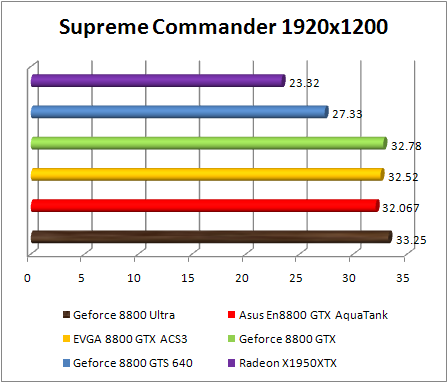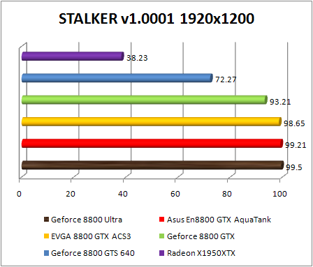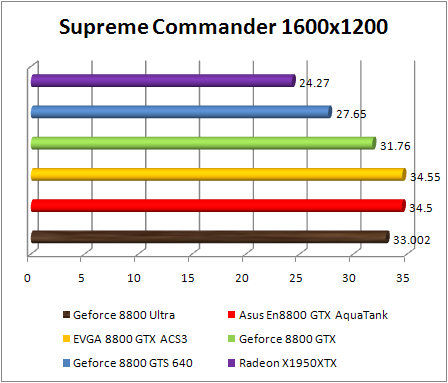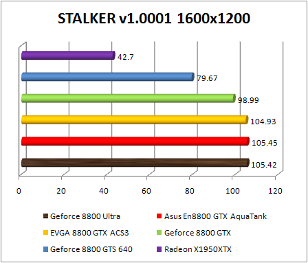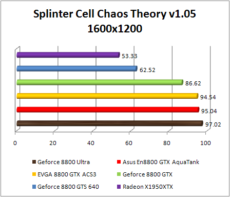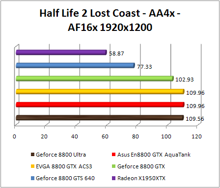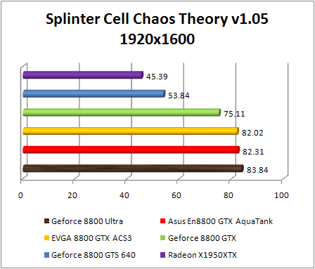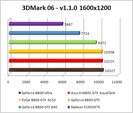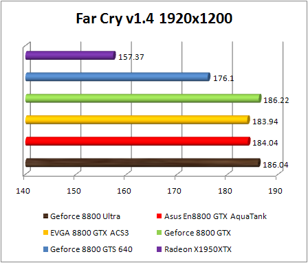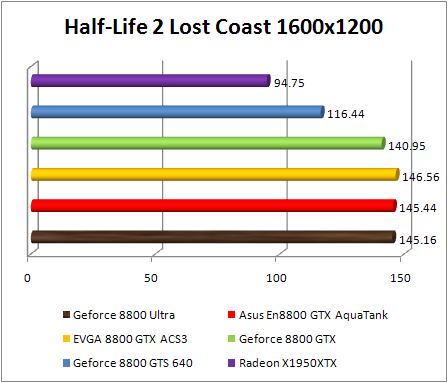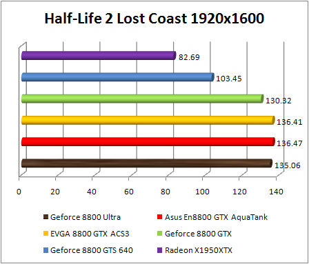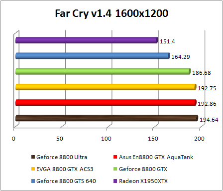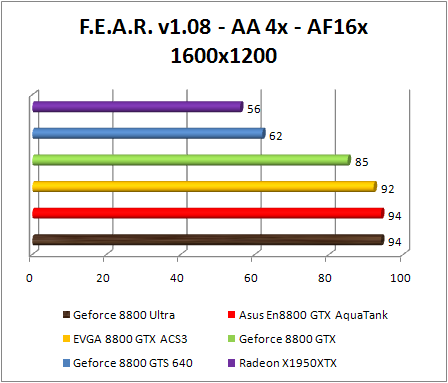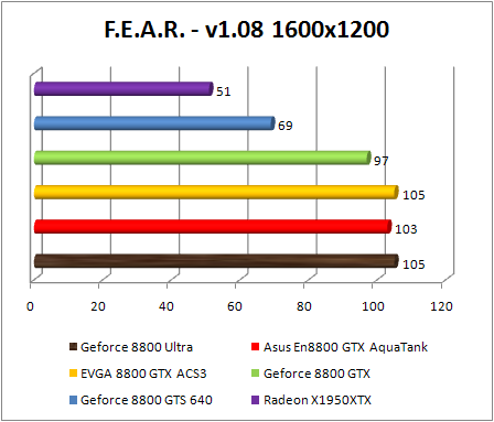 F.E.A.R. confirms the preceding observations by classifying Asus GeForce 8800 GTX Aquatank with equality with the EVGA e-GeForce 8800 GTX and also with GeForce 8800. If Ultra .We note that in 1920x1200, the GeForce 8800 Ultra is 8% faster than the reference GeForce 8800 GTX , and 10% faster in 2560x1600. The GeForce 8800 ultra still twice faster than the Radeon X1950 XTX .