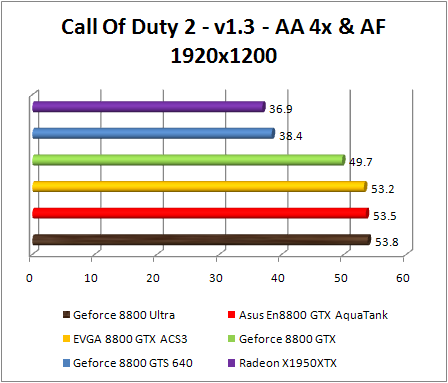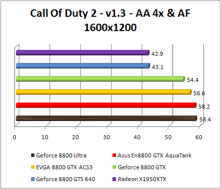 Here various filtering options was activated , Call Off Duty 2 draws up a panorama rather similar to that observed until now about the performances of our cards. . This game was in favor of Radeon X1950 XTX, in this test the ati card was able to compete with GeForce 8800 GTS 640 Mb in the lowest Resolutions.