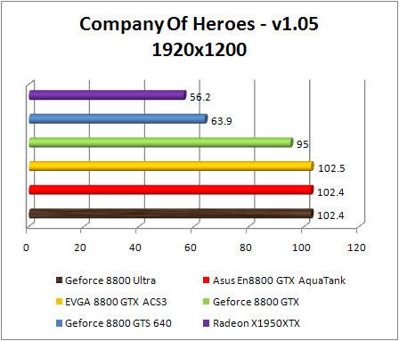 Company Of Heroes was in favor of GeForce 8. the GeForce 8800 Ultra is once again at the head, with a small boost over our two overclocked GeForce 8800 GTX witch show identical performances .The GeForce 8800 Ultra is 63% faster than GeForce 8800 GTS 640 MB and 86% faster than the Radeon X1950 XTX.