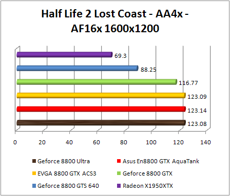 The activation of anti-aliasing 4x and anisotropic filtering 16x in Half-Life 2 allow the Radeon X1950 XTX to catch the GeForce 8800 GTS 640 Mb, but this last still 33% faster ..