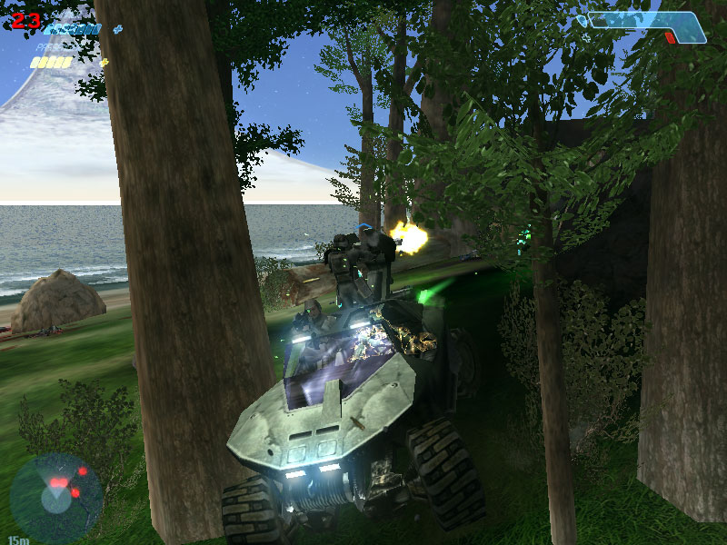 The weapons featured in the game, both human and alien, are original, ingenious, and evenly balanced. Not only do they pack a punch against the right opponents, but when the ammo runs out, players can use them in melee mode to bludgeon the opposing forces into submission. My favorite of the bunch are the Covenant’s Needler, a porcupine-shaped hand weapon that fires heat-seeking purple glass shards at opponents; on top of the immediate pain incurred on contact, the weapon dishes out a wallop of damage as the shards explode in a puff of purple smoke and the sound of tinkling crystal. Honourable mention goes to the plasma grenades, little greenish-blue sticky grenades which, much like satchel charges in the Myth series, set off a chain reaction of explosions with other plasma grenades in the blast vicinity.