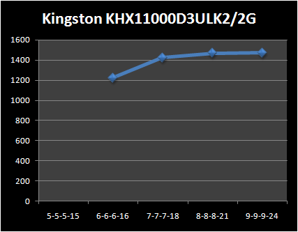 Kingston memory modules (elpida chips) react weakly to increase in the supply voltage : with 2.1 v , the maximum frequency was only 1486 MHz. Thus, Kingston KHX11000D3ULK2/2G is interesting only by its low latencies with frequencies, close to 1333 MHz.