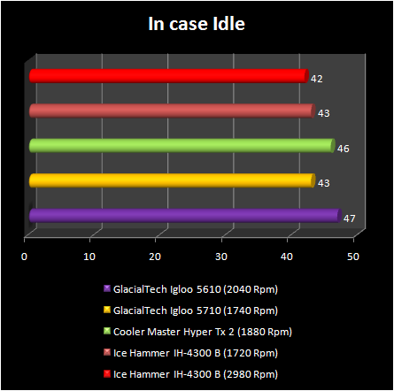 The second cooler glacialTech igloo 5710 Silent demonstrates better results . This cooler is more effective than Igloo 5610 Silent by 9~12 degree Celsius , and it is compared with respect to the effectiveness of Ice hammer IH-4300 B in the quiet fan regime . We note that IH-4300 B is cheaper than Igloo 5710 Silent.