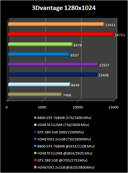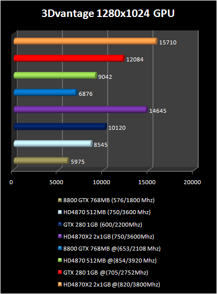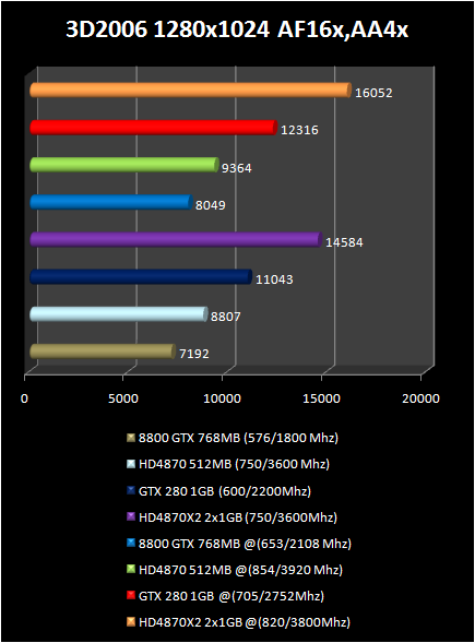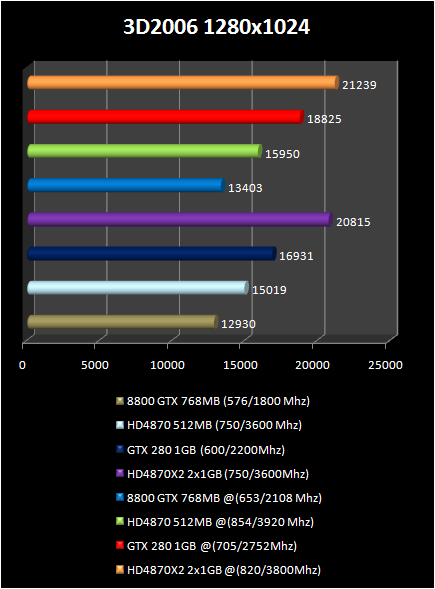 Note that on the first picture @ 1280 X 1024 resultion the single Radeon HD 4870 is faster that the two-chip HD 4870 X2. This is due to the central processor : in this case the Radeon HD 4870 X2 takes away more system resources, than the single-processor Radeon HD 4870 . .