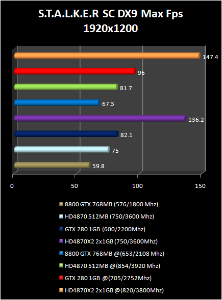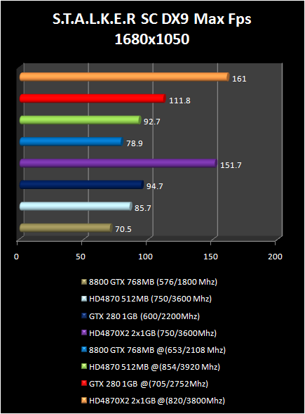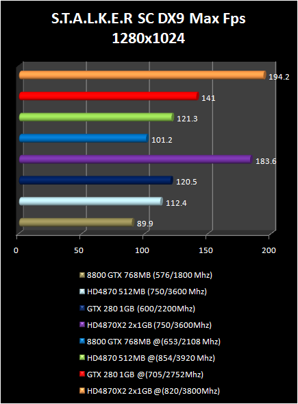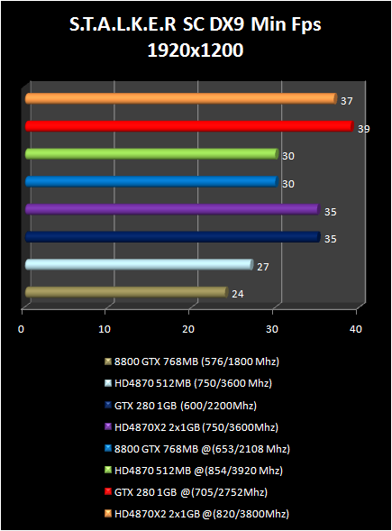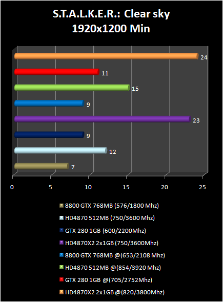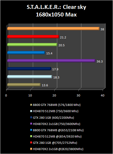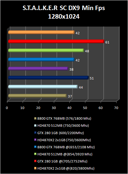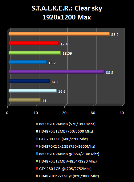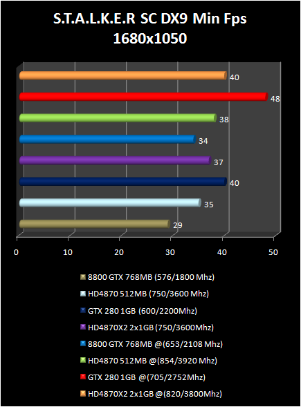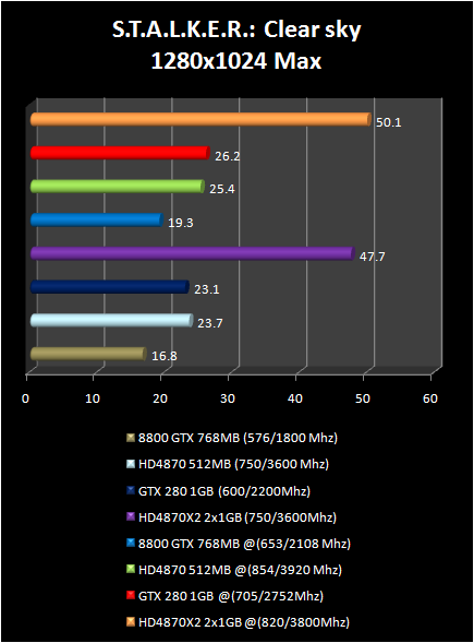 In the old game version S.T.A.L.K.E.R , the two-chip Radeon HD 4870 X2 does not leave the geForce GTX 280 any chances . At the same time the minimum FPS rate on the new ATi card is often lower than the GeForce GTX 280, although this fact does not affect the gaming process.