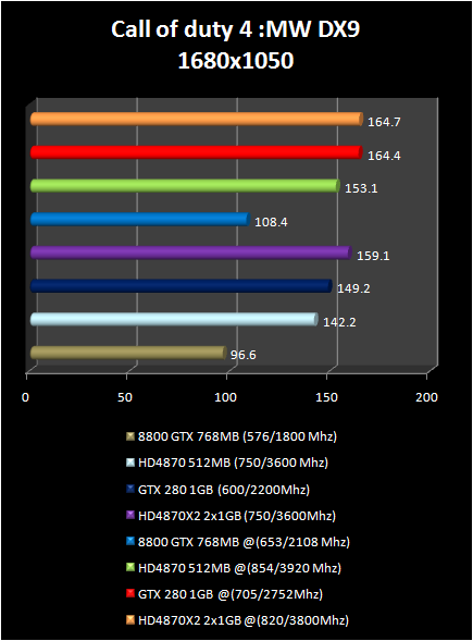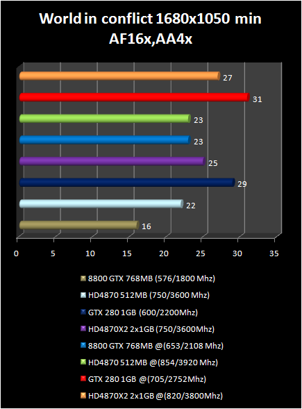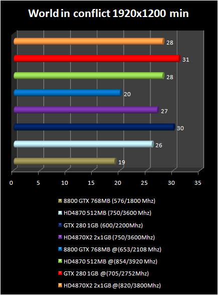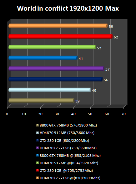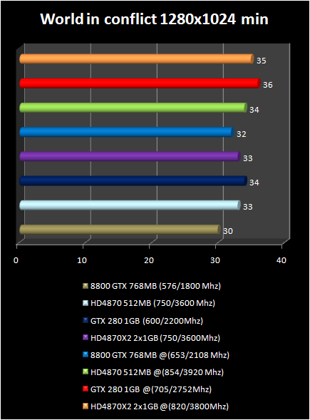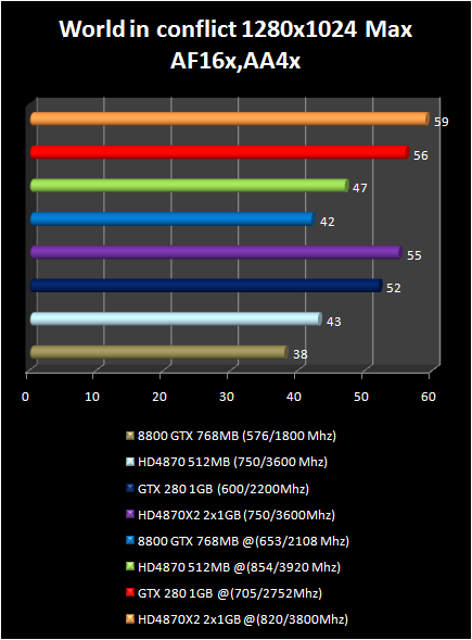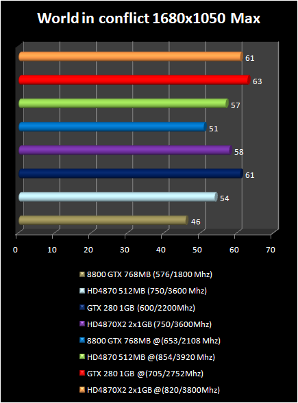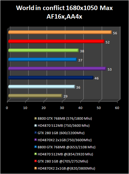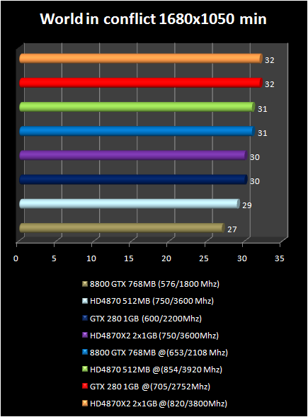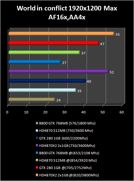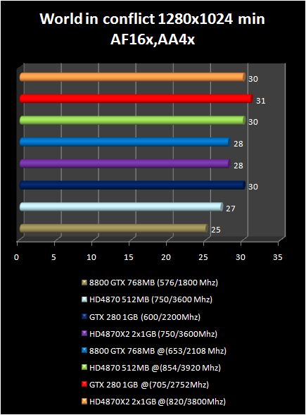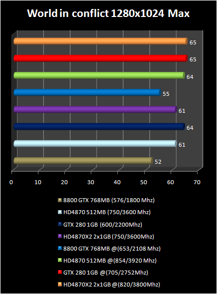 But here in the popular game world in conflict the perfomance is somewhat different. In the pure speed regime (without AA and AF) , the video card are limited by the central processor power (Note this is our overclocked Core 2 Duo @4.33 GHz!). As soon as the resolution is increased the difference in speed became clear . Here the Radeon HD 4870 again is faster than the good old GeForce 8800 GTX.